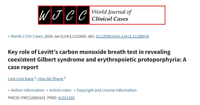 2026年,深圳市南山区人民医院在《World Journal Of Clinical Cases》在线发表了题为“Key role of Levitt’s carbon monoxide breath test in revealing coexistent Gilbert syndrome and erythropoietic protoporphyria: A case report”的病例报告
